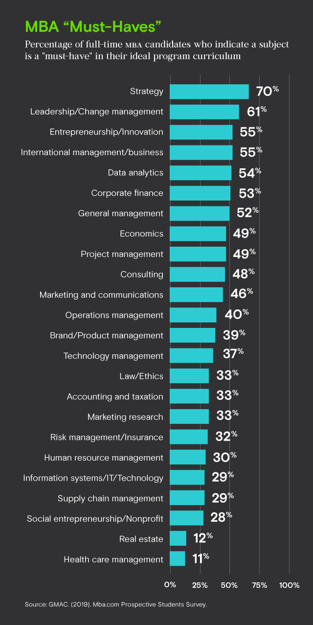 Additionally, candidates say that economics (49 percent), project management (49 percent), consulting (48 percent), marketing and communications (46 percent), and operations management (40 percent) are also must-haves in their ideal curriculum.