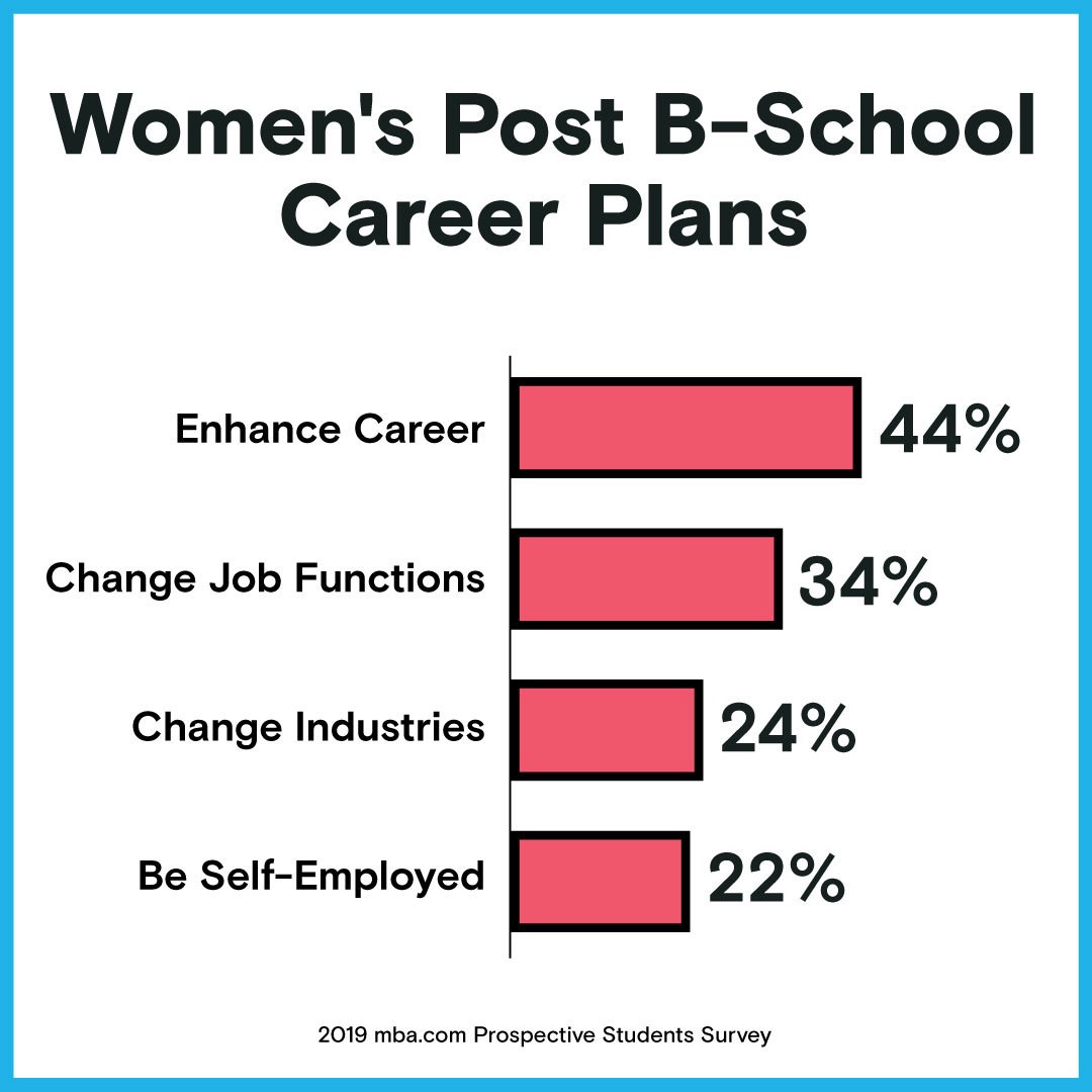 A recent survey conducted by the makers of the GMAT exam revealed that women plan to use their business master’s degrees to pursue a variety of post-GME career plans. A majority of female b-school candidates plan to either switch job functions or change industries (35% and 24%), and 44 percent plan to use their degree to enhance their current career path. For the career enhancers, that doesn’t necessarily mean staying where they are; only 10 percent of women plan to continue working for their current employer. Interestingly, the number of women who want to be entrepreneurs is growing. Nearly 1 in 4 women have entrepreneurial aspirations, up from only 16 percent in 2010.