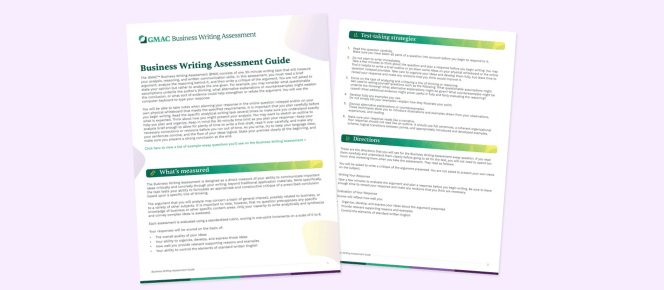 Preparing for the Business Writing Assessment is made easy with GMAC's prep resources! Use the tips and tools in the free prep guide, see a list of example essay questions, and take advantage of Official Practice.